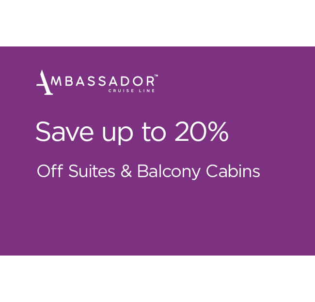 Step onboard Ambassador and Treat Yourself to a memorable escape with up to 20% off Balcony and Suite cabins^. Enjoy a private balcony with peaceful sea views and a suite that’s just the right size for relaxing. It’s the perfect way to unwind and leave the everyday behind, because moments matter.